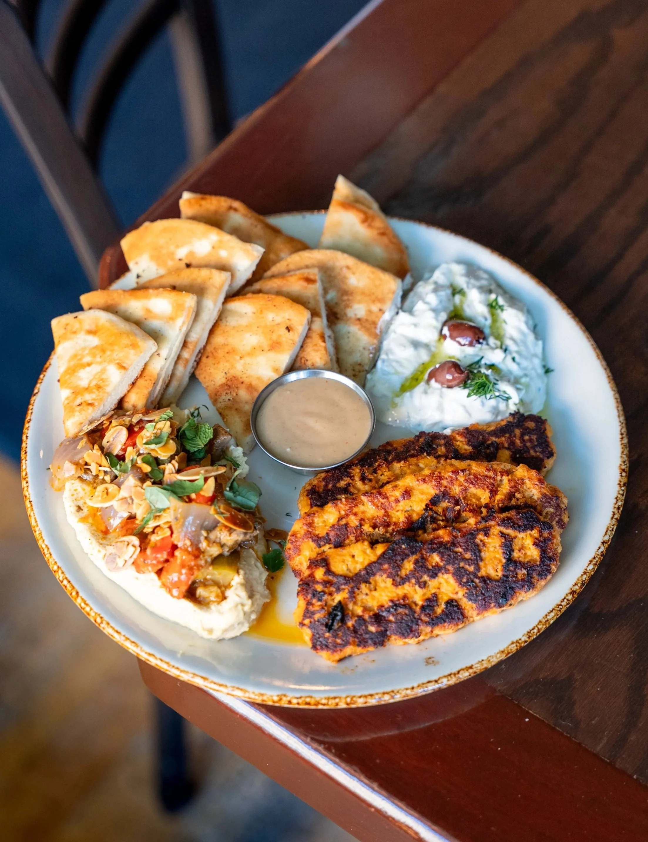 chicken kofta, tzatziki, kalamata olives, dill, lemon hummus, sun-dried tomato pesto vegetables, herbs, olive oil, toasted almond, garlic naan