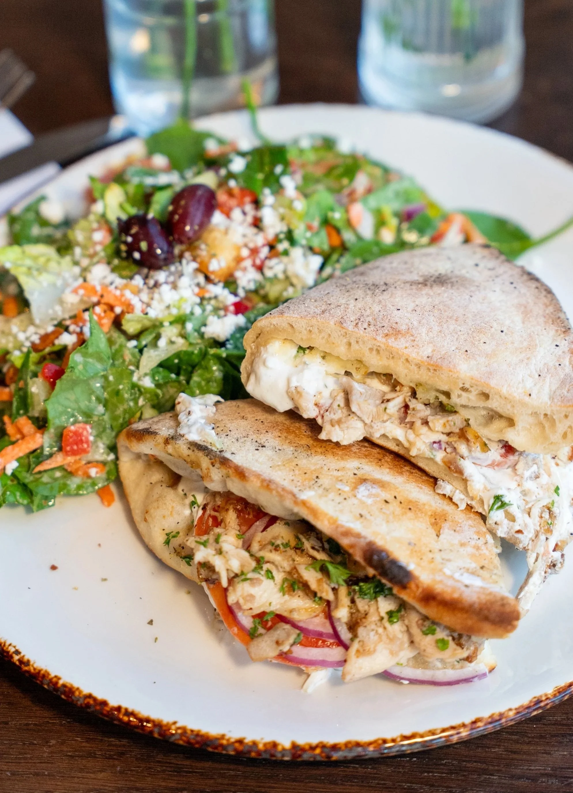 shaved marinated chicken, tomato, onion, feta, tzatziki, parsley served on a cheesy pita with modern greek salad