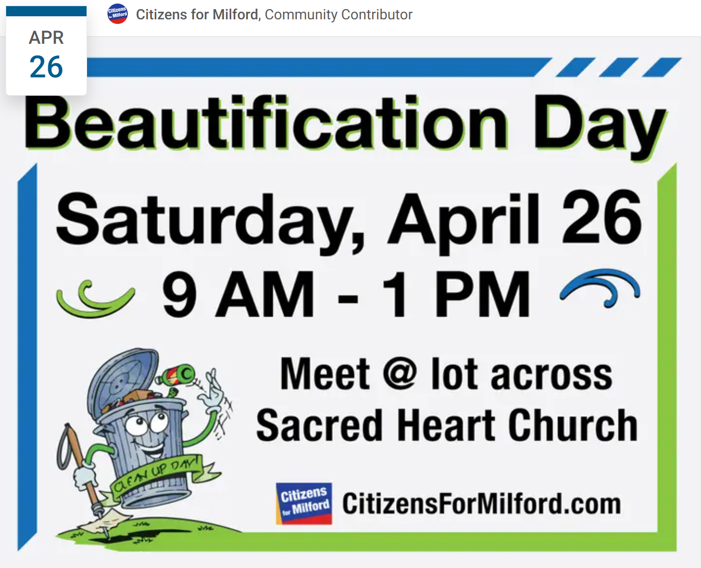 Citizens for Milford is organizing the Tenth Annual Milford Beautification Day, Milford’s annual clean-up event, which enables area residents, organizations, and businesses to work together to beautify our community by picking up trash around town.